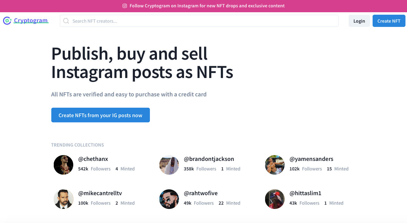 Cryptogram lets you publish and mint your Instagram posts into buyable and sellable NFTs in minutes. It provides you a 100% free minting experience with no hidden fees, and allows you to sell the NFT, make money and keep the copyright over the post.We currently have an opportunity to find a niche for our platform where it can drive tremendous revenue. You can purchase NFTs with your credit card through our platform and there are many more reasons why this marketplace needs more attention fast.