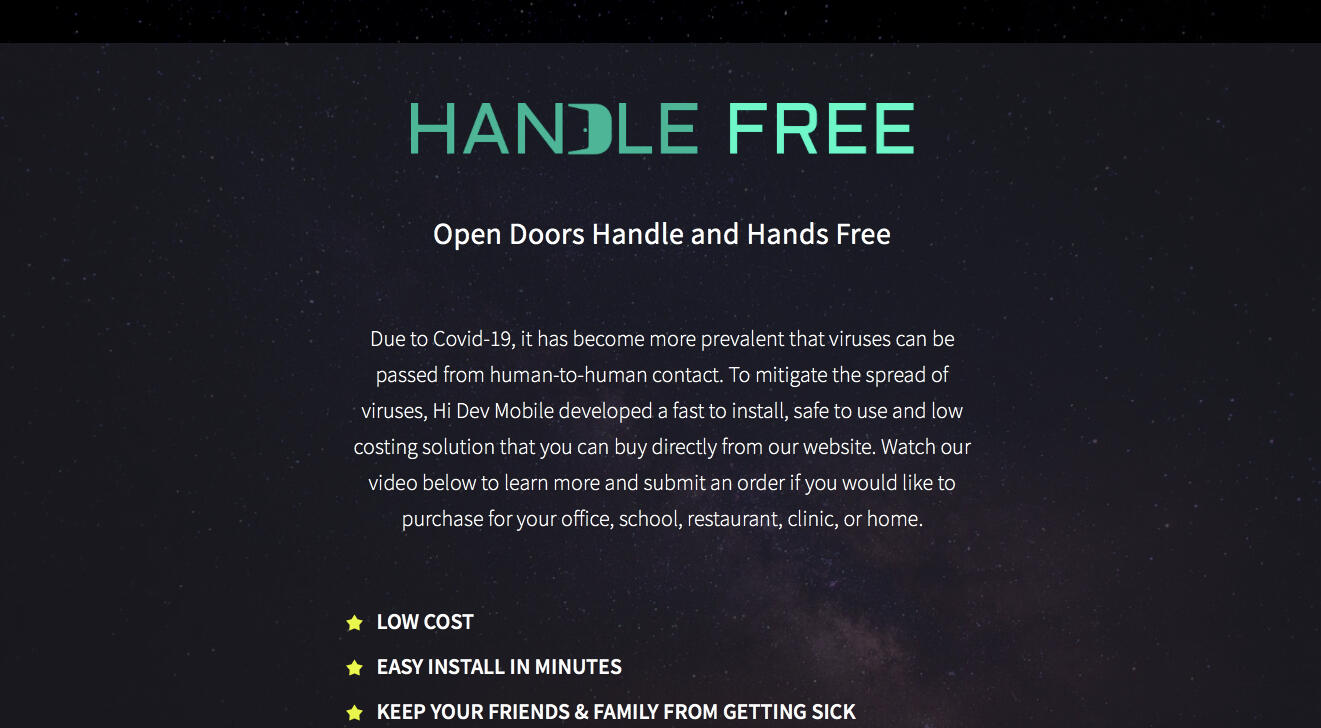 To mitigate the spread of viruses, we created a device to open doors Handle and Hands Free. A fast to install, safe to use and low costing solution, perfect for your office, school, restaurant, clinic, or home.Mayo Clinic approached me to develop this for their internal labs, and now I own the rights to developing and selling this solution globally.